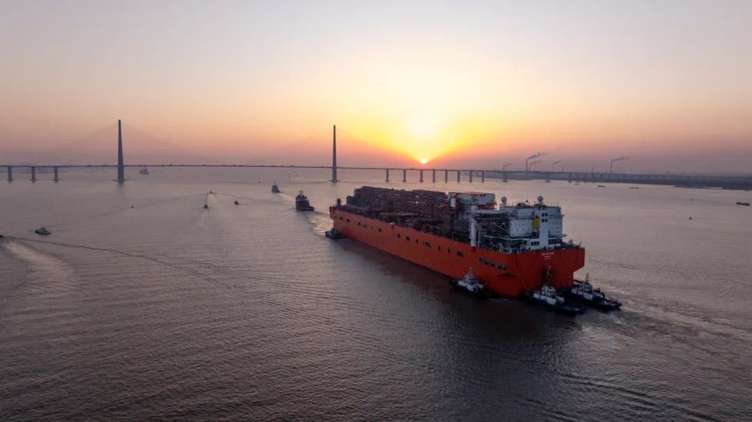 近日,我國首座大型浮式天然氣液化裝置出江,705米拖帶船隊長度創(chuàng)長江歷史之最。在海事部門10艘海巡艇的接力維護下,由惠生清潔能源建造的我國首座大型浮式天然氣液化裝置“NGUYA FLNG”輪順利離開長江江蘇段,前往舟山船廠碼頭進行后續(xù)舾裝作業(yè)。